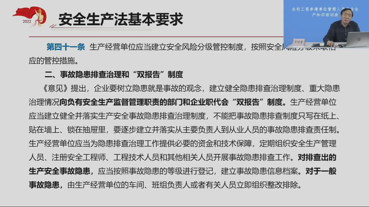 本次培训全程使用"钉钉"线上直播的方式开展。培训对象为水利工程参建单位管理人员。培训内容为安全生产有关的法律、法规、规章及标准;安全生产管理、安全生产技术、职业健康管理等;伤亡事故、职业危害管理等;危险源管理、应急管理等;监督安〔2022〕1号安全生产问题清单解析;典型事故案例分析。
